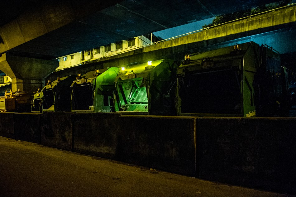 21:30 น. คือเวลาที่พวกเราเดินทางมาถึงลานจอดรถขยะเขตบางรัก ซึ่งอยู่บริเวณใต้ทางด่วน ในซอยเจริญกรุง 39 ความมืดมิดปกคลุมทั่วพื้นที่ มีเพียงแสงไฟสลัวๆ จากโคมไฟของพี่ๆ พนักงานขับรถขยะเท่านั้นที่ทำให้มองเห็นรถเก็บขยะสีเขียวหลายขนาดนับสิบคันจอดเรียงรายรอเวลาออกปฏิบัติหน้าที่ซึ่งมีไม่รู้จบ
