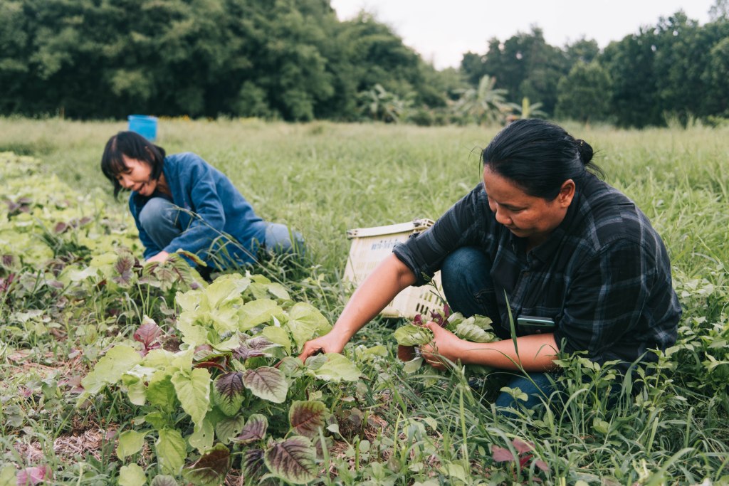 พลูเพ็ชรและเพื่อนสมาชิกกลุ่มเกษตรอินทรีย์ อำเภอสนามชัยเขต จังหวัดฉะเชิงเทรา กำลังเก็บผักในพื้นที่เกษตรกรรมของกลุ่มเพื่อเตรียมนำไปจำหน่าย