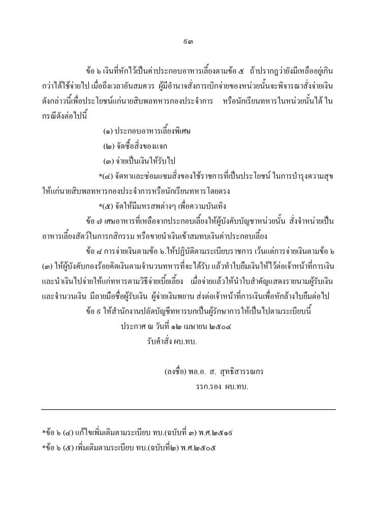 ระเบียบกองทัพบกว่าด้วยการใช้จ่ายเงินเบี้ยเลี้ยงประจำ พ.ศ.2504 ที่ระบุวิธีการเบิกจ่ายเบี้ยเลี้ยงที่เหลือจากการประกอบเลี้ยงทหาร