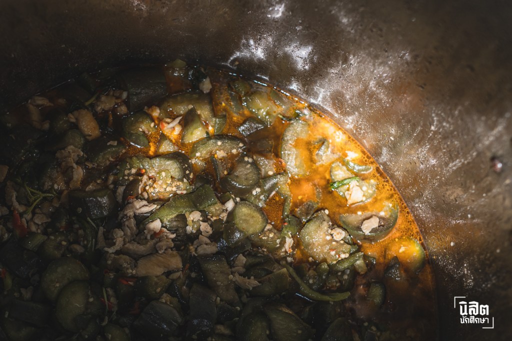 ผัดมะเขือยาวใส่ไก่ กับข้าวในค่ายทหารแห่งหนึ่งในกรุงเทพมหานคร