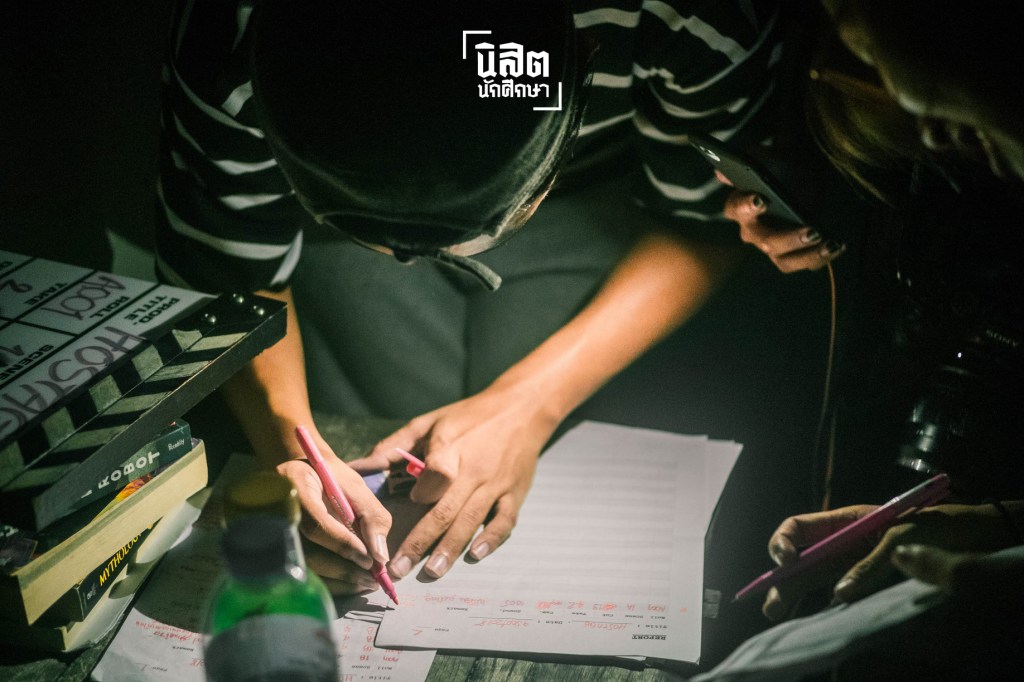 ทีมงานใช้ไฟฉายจากโทรศัพท์มือถือให้ความสว่างเพื่อเขียน “รีพอร์ท” หรือรายงานที่แจกแจงรายละเอียดเกี่ยวกับการถ่ายทำแต่ละครั้ง