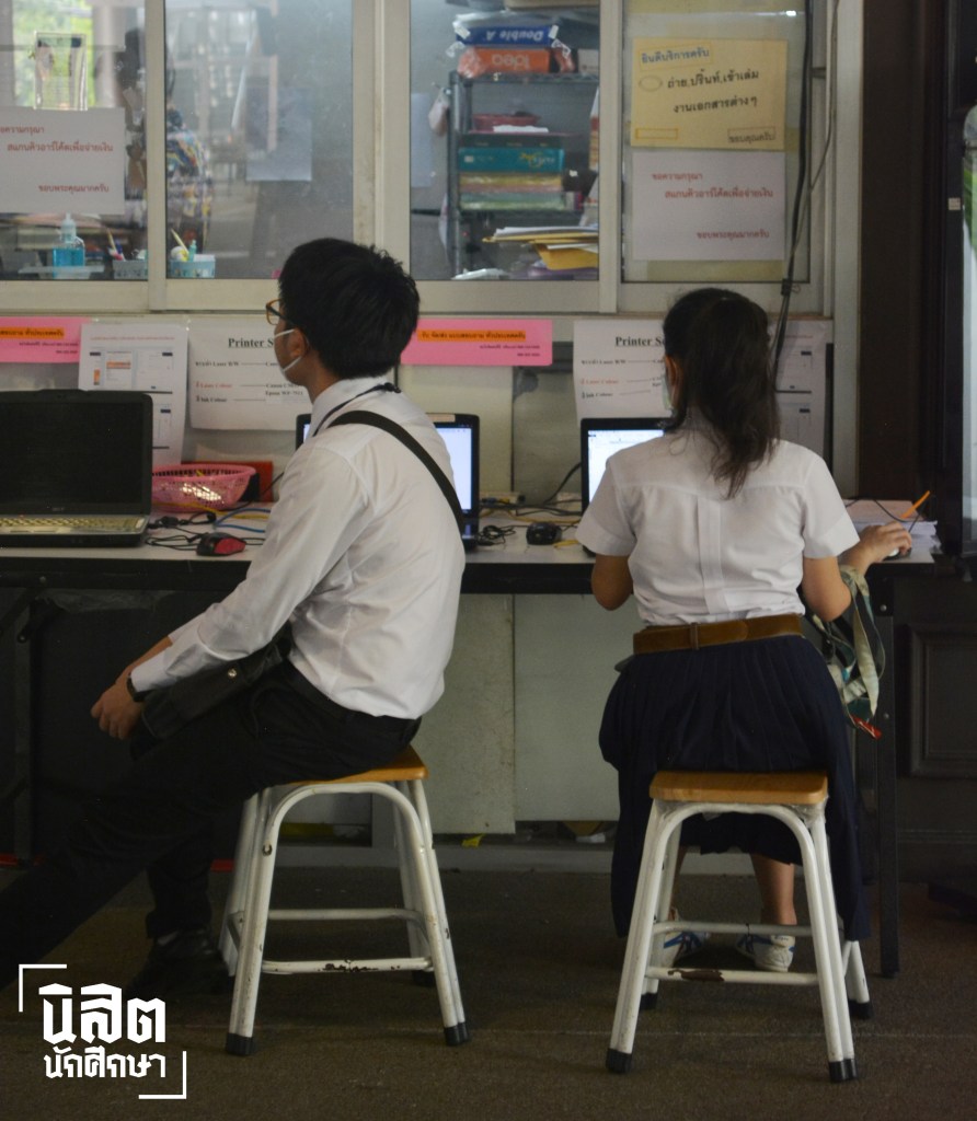นิสิตในชุดเครื่องแบบกำลังใช้บริการร้านถ่ายเอกสารที่คณะครุศาสตร์