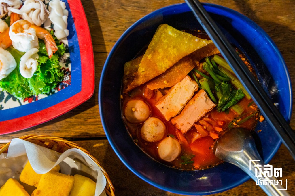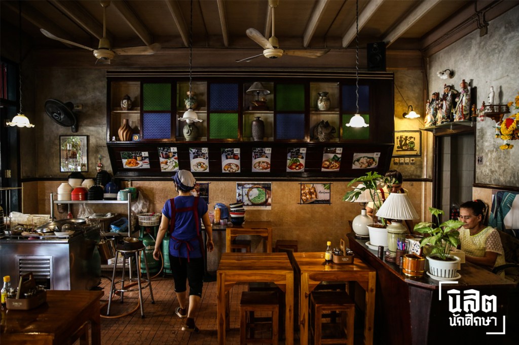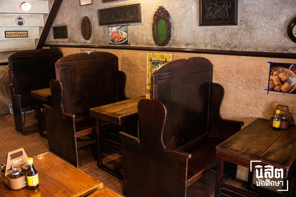ในอดีต ร้านอาหารบนถนนเส้นนี้มีเพียงร้านข้าวแกง ร้านอาหารตามสั่ง และร้านก๋วยเตี๋ยวของชาวจีน ซึ่งภายหลังร้านก๋วยเตี๋ยวที่ใกล้ที่สุดคือ บางลำพู จึงเป็นสาเหตุส่วนหนึ่งที่เอิ้งเลือกเปิดร้านเย็นตาโฟบนถนนพระสุเมรุ ประกอบกับวิธีปรุงที่ไม่ยุ่งยากจึงพัฒนาสูตรซอสมาตลอด 25 ปี โดยเย็นตาโฟสูตรเด็ดของร้านมาพร้อมเส้นใหญ่ที่ให้สัมผัสเหนียวนุ่ม ประดับด้วยลูกชิ้นปลา และเกี๊ยวกุ้งคุณภาพดีขนาดเต็มคำ ผสมด้วยน้ำซุปและซอสสีชมพูกลมกล่อม อร่อยถึงขั้นซดหมดชาม ระหว่างสนทนาเรามองดูบรรยากาศรอบร้านที่สะท้อนภาพในอดีตของย่านนี้ ผ่านการตกแต่งด้วยเครื่องเรือนโบราณอย่างโคมไฟห้อยทรงเก่า ตู้ไม้ติดผนังแบบจีน ภาพฟิล์มขาวดำ และชุดโต๊ะเก้าอี้รถไฟอายุกว่า 90 ปี ซึ่งตกทอดมาจากบิดาของเอิ้ง