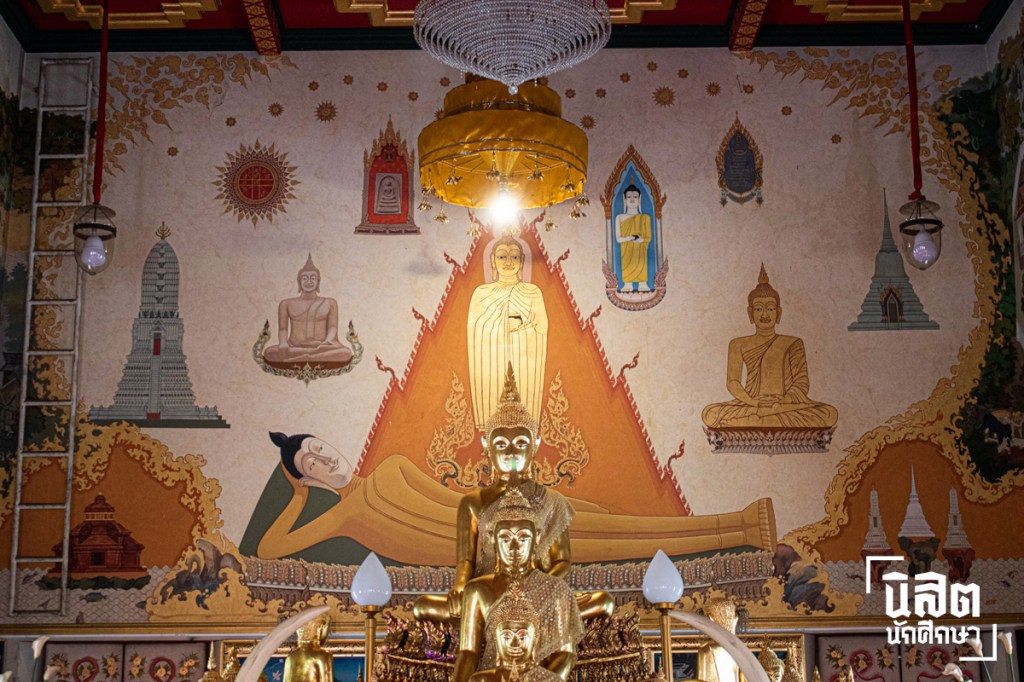 พระเครื่องรุ่นดังและปูชนียวัตถุที่สมเด็จโตฯ เป็นประธานในการสร้าง รวมถึงพุทธสถานสำคัญหลายแห่งในประเทศไทยปรากฏอยู่บนผนังรอบด้าน แสดงให้เห็นถึงสังคมที่ตั้งอยู่บนความเชื่อและความศรัทธา ทั้งในพุทธศาสนาและตัวบุคคล เมื่อมองไปยังผนังด้านซ้ายมือของพระประธาน เราสะดุดตากับภาพวังบางขุนพรหมและชาวบ้านที่นุ่งผ้าซิ่น สวมเสื้อแขนยาวทรงกระบอกตามแบบชาวลาว