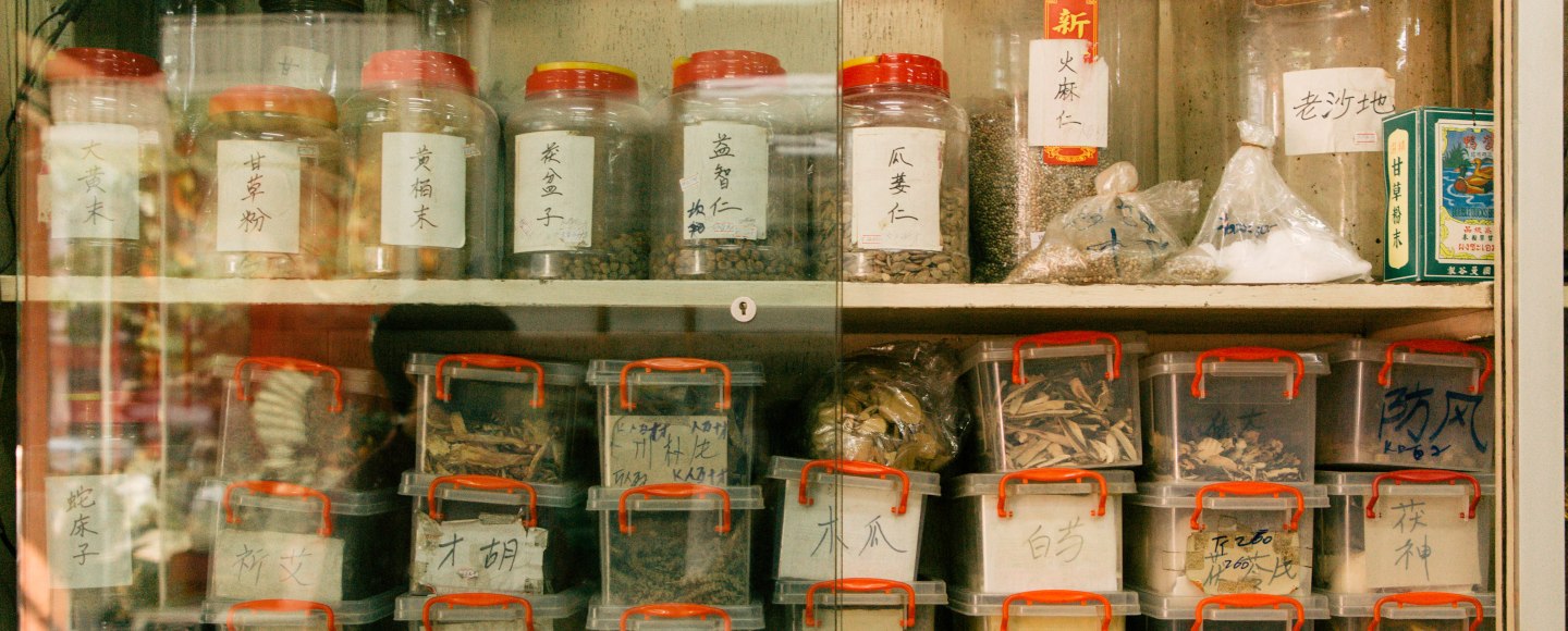 ชั้นสำหรับเก็บยาสมุนไพร ตามบรรจุภัณฑ์จะมีป้ายชื่อยาเป็นภาษาจีน ซึ่งต้องอาศัยทั้งทักษะการอ่านและจดจำ