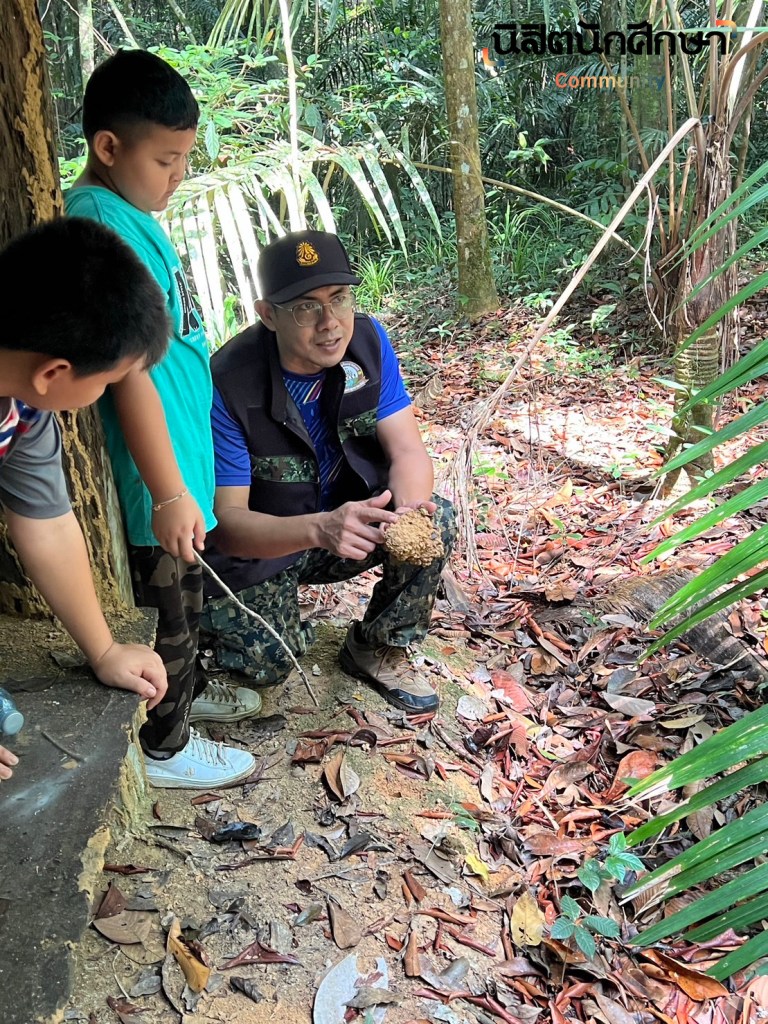 รองฯ ตากำลังทำหน้าที่เป็นไกด์อธิบายเกี่ยวกับต้นไม้ในป่าให้เด็กในหมู่บ้านฟัง