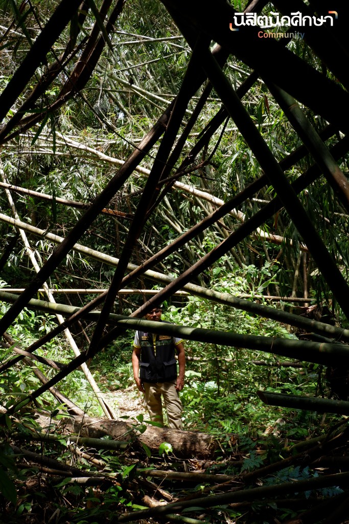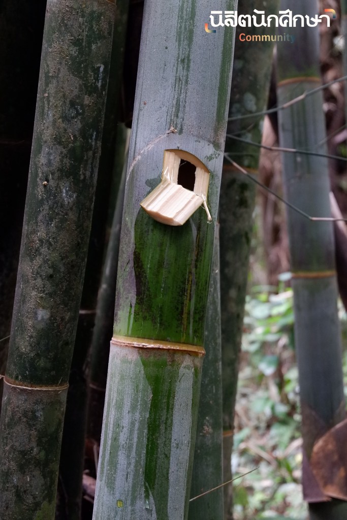 ‘ไผ่’ ไม้ที่ดูธรรมดาแต่มีความพิเศษ ก็มีให้เห็นเป็นระยะ ๆ ทั่วทั้งป่า นอกจากจะเป็นแหล่งที่เราจะได้หน่อไม้ขนาดใหญ่กลับไปแกงกินแล้ว ลุงบุญเลิศสอนว่านี่ยังเป็นแหล่งน้ำธรรมชาติอีกด้วย หากหลงป่าแล้วหิวน้ำ การเจอดงไม้ไผ่อาจทำให้เราได้เจอน้ำสะอาดโดยไม่ต้องเดินไปถึงลำห้วย ว่าแล้วลุงบุญเลิศก็ใช้พร้าคู่ใจผ่าปล้องไม้ไผ่ให้ดู แถมเหลาก้านไม้ไผ่เป็นหลอด d.i.y. แถมให้ด้วย ลุงบุญเลิศยังให้ทริคอีกว่าต้องเลือกปล้องที่ดูใหม่หน่อย หากเก่าแล้วน้ำอาจไม่สะอาด และให้ดูสีน้ำที่กระฉอกออกตอนผ่าปล้อง ตรวจเช็คความใสสะอาดก่อนดื่ม