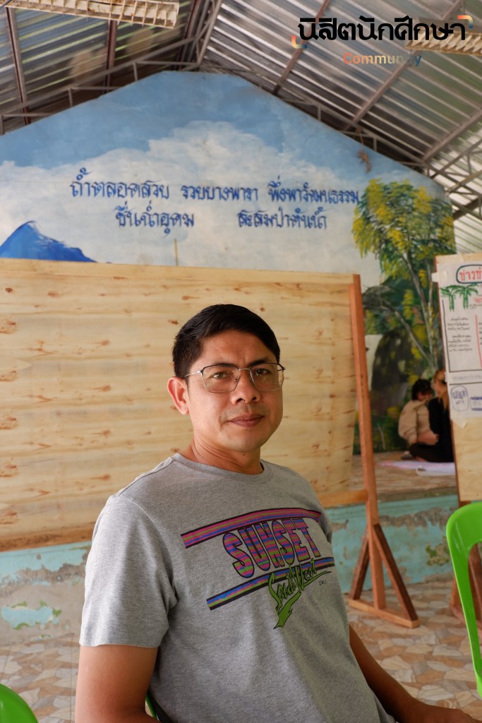 มนพ ประพฤติชอบ หรือ รองฯ ตา ขณะนั่งคุยกับนิสิตนักศึกษาที่มาทัศนศึกษาที่บ้านถ้ำตลอด