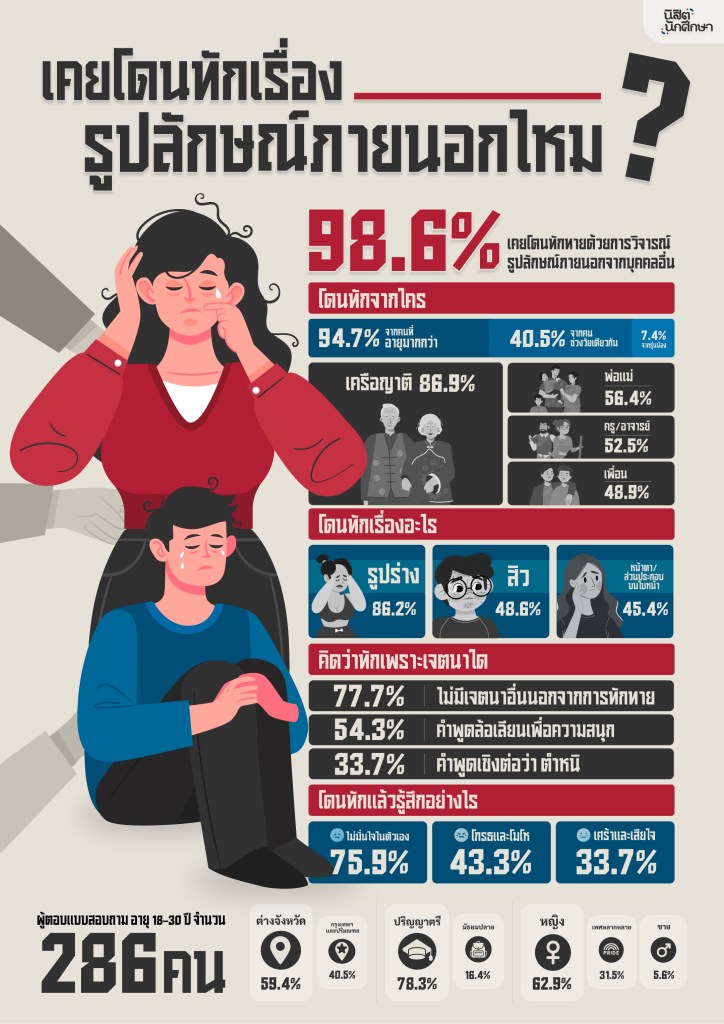 ผู้ตอบแบบสอบถาม 98.6% เคยถูกทักทายด้วยการวิจารณ์รูปลักษณ์ภายนอก