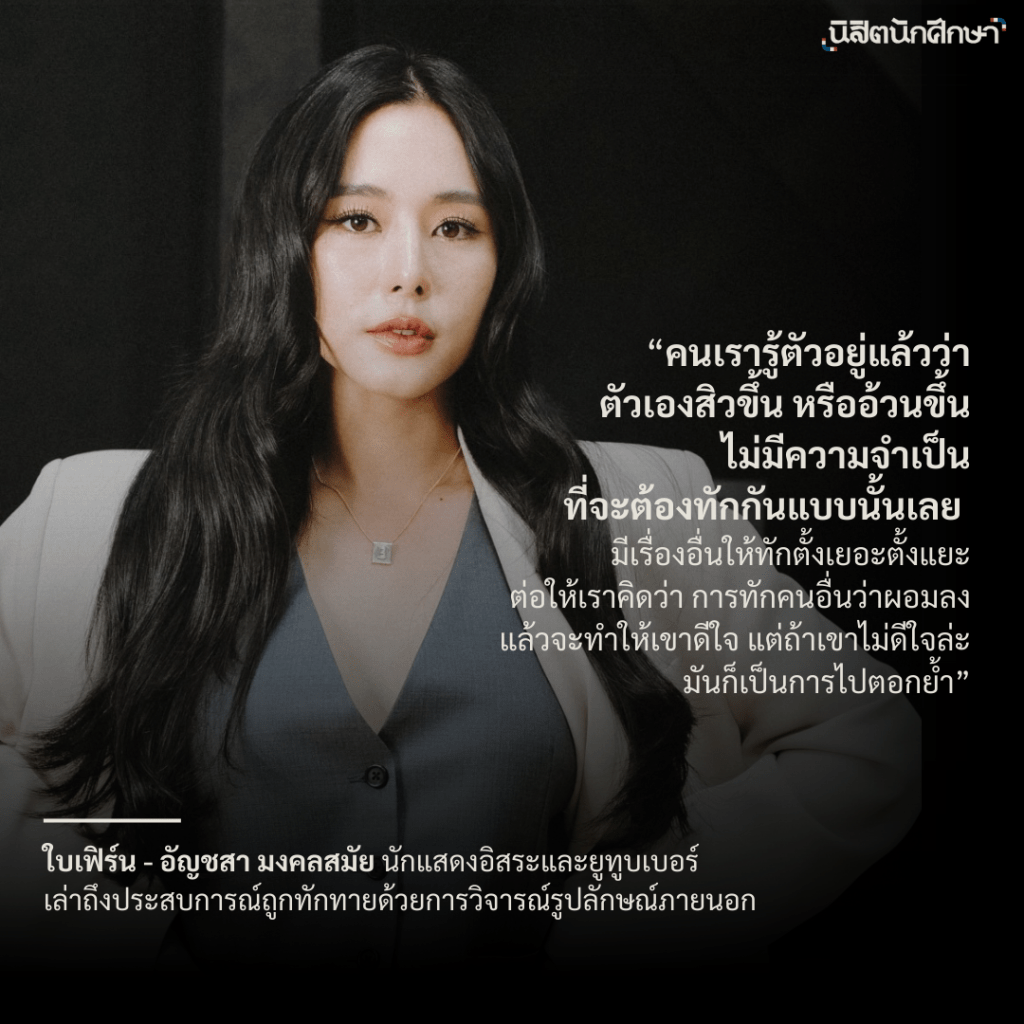 “Beauty Standard ส่งผลให้ผู้คนทักทายกันด้วยรูปร่างภายนอกอยู่แล้ว โดยเฉพาะคนรุ่นเก่าที่มี Beauty Standard ในแบบของเขา แบบไหนคืออ้วน แบบไหนคือผอม เพราะฉะนั้น ถ้ามันไม่ตรงตามสิ่งที่เขาคิด เขาก็จะทักว่า อ้วนขึ้นหรือเปล่า ผอมลงหรือเปล่า”